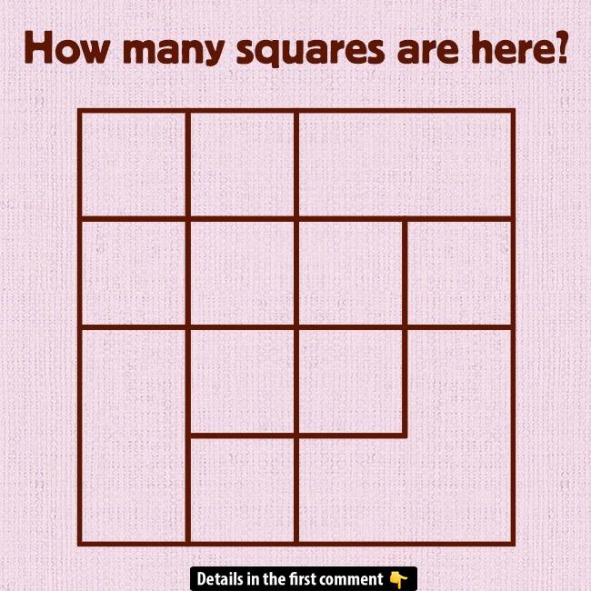 Ready for a deceptively simple brain‐teaser? At first glance, it looks like a 4×4 grid—but hidden inside are extra, overlapping squares waiting to be discovered. You might spot the 16 small blocks right away, but what about the 2×2, 3×3, the giant 4×4, and that off-center square formed by bold lines? Take your time, trace every possible combination, and see if you can count all 31 distinct squares before scrolling down for the breakdown. Challenge yourself, share your total in the comments, and test your friends to see who can beat your score!