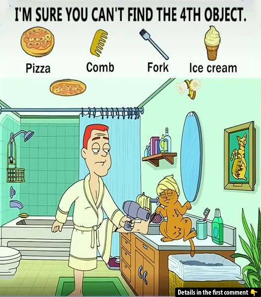 Think you’ve got eagle‑eyes? This deceptively simple bathroom scene hides four everyday objects—pizza, comb, fork, and ice cream—in the most unexpected spots. Scroll up, study every corner, and see if you can spot them all before reading on. Ready to put your attention to the test? Share your guesses in the comments!